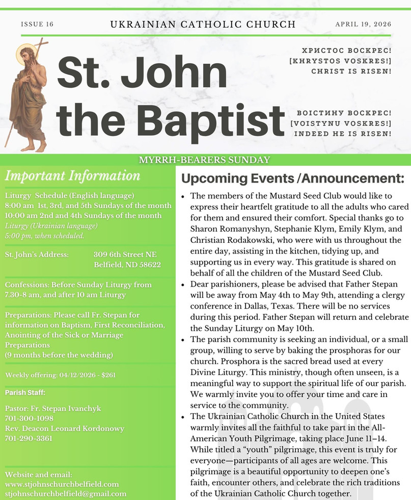 Dear parishioners, please be advised that Father Stepan will be away from May 4th to May 9th, attending a clergy conference in Dallas, Texas. There will be no services during this period. Father Stepan will return and celebrate the Sunday Liturgy on May 10th.