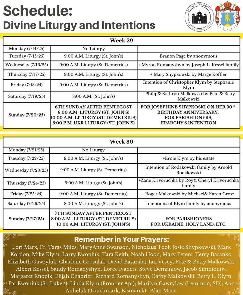 MARRIAGE BANNS: As required by §784 CCEO and §105 of the Particular Law of UCC and the norms of the Church, we hereby publish the marriage banns of the following couple: Mr. Alex Piasta wishes to contract Holy Matrimony with Ms. Hannah Nameniuk. The date of Marriage is July 26, 2025. Anyone who knows of any canonical impediment to the proposed marriage of the couple listed above is requested to inform the parish office as soon as possible.