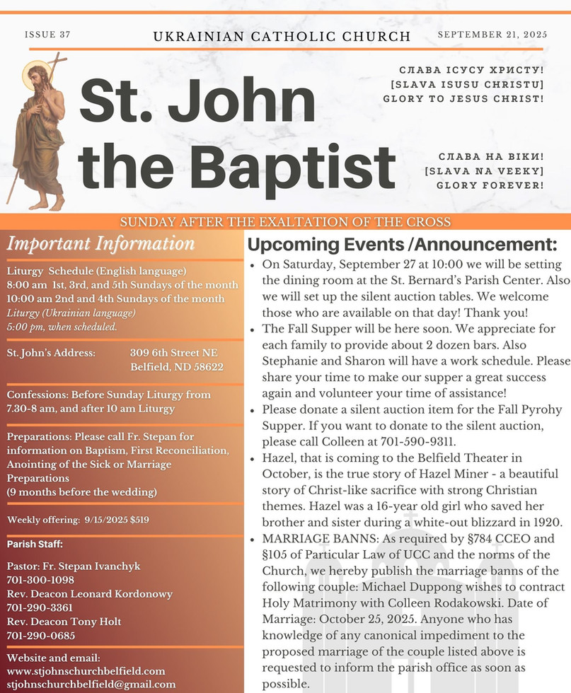 MARRIAGE BANNS: As required by §784 CCEO and §105 of Particular Law of UCC and the norms of the Church, we hereby publish the marriage banns of the following couple: Michael Duppong wishes to contract Holy Matrimony with Colleen Rodakowski. Date of Marriage: October 25, 2025. Anyone who has knowledge of any canonical impediment to the proposed marriage of the couple listed above is requested to inform the parish office as soon as possible.